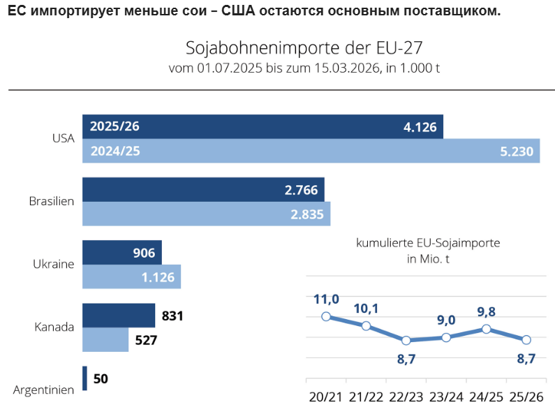 • Соя является наиболее важной масличной культурой, импортируемой в Европейский Союз, опережая рапс. С июля 2025 года по середину марта 2026 года ЕС импортировал наименьшее количество сои за три года.   далее